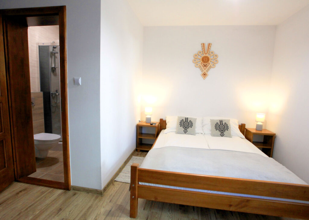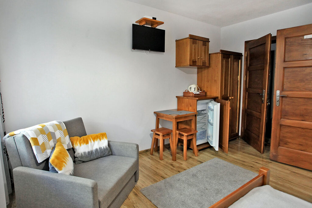 Pokój oferuje komfortowe łóżko małżeńskie o wymiarach 160/200 oraz rozkładany fotel typu amerykanka (90/190), który pełni funkcję dostawki. W pomieszczeniu znajduje się telewizor, lodówka oraz czajnik, zapewniając wygodę podczas pobytu. Prywatna łazienka wyposażona jest w kabinę prysznicową, gwarantując komfort i prywatność.